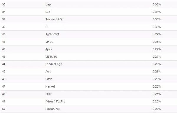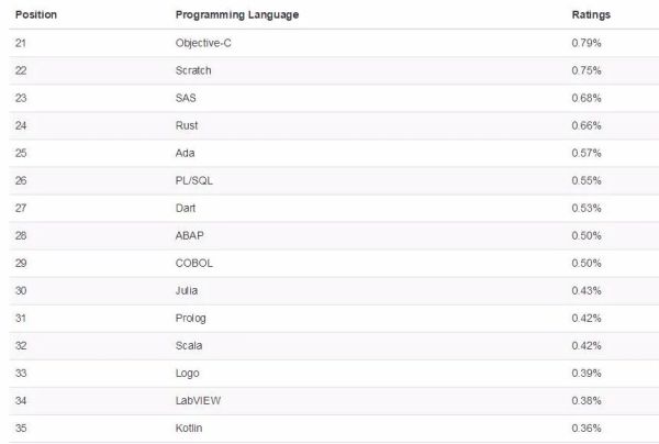 榜单中,11名-20名之间,排名出现了一些细微的变化,部分语言均有位置提升:Ruby(13位→11位);R(16位→13位);Groovy(17位→14位);MATLAB(19位→15位)。除排名上升外,还有部分语言出现排名下降:Classic Visual Basic(11位→12位);Go(14位→16位);Delphi/Object Pascal(12位→17位);Swift(15位→18位);Perl(18位→19位)。