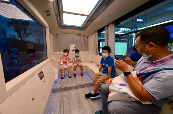 7月7日,世界人工智能大会体验日,观众参观了自动驾驶AR小巴。