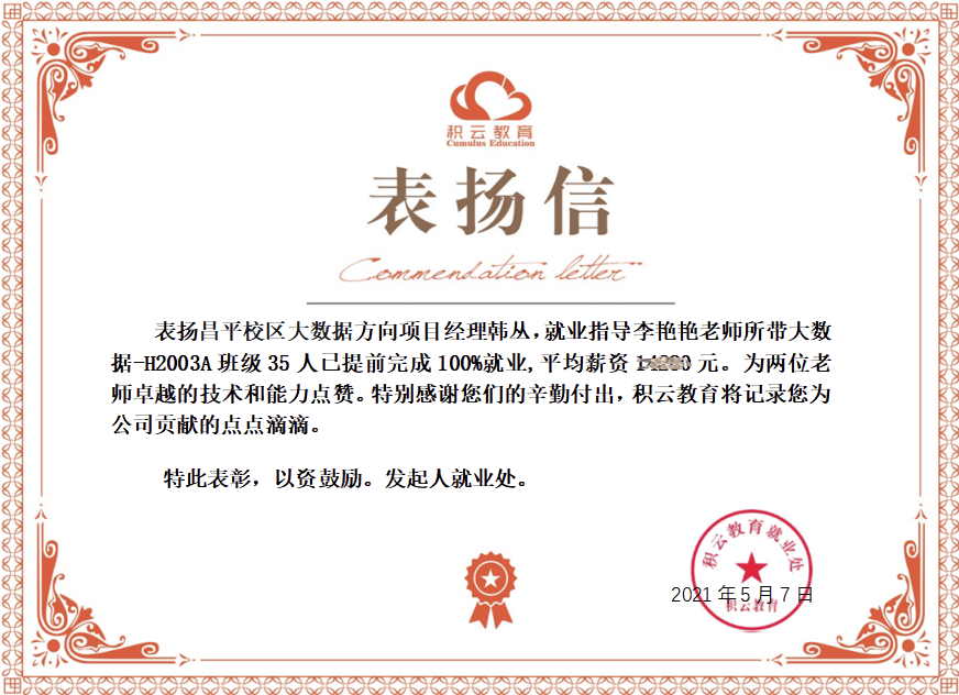 5月伊始,积云教育大数据就业率再创辉煌,表扬积云教育昌平校区大数据方向项目经理韩丛,就业指导李艳艳老师所带大数据-H2003A班级35人已提前完成100%就业,均薪14280元。为两位老师卓越的技术和能力点赞。特别感谢您们的辛勤付出,积云教育将记录您为公司贡献的点点滴滴。