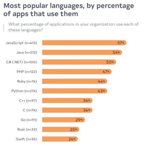 JavaScript在榜单中排名第一,有57%以上的团队都使用了JavaScript。Java语言上升到了第2名,达到54%,它已经是大型企业内部应用程序不可或缺的一部分。