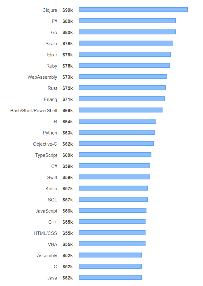 StackOverflow 2019年的调研数据,全球范围内,编程语言的收入排行如下: