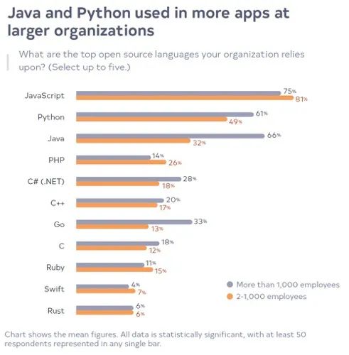 值得一提的是,大型软件开发团队会选择3/5种以上编程语言进行开发。