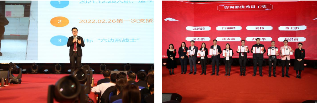 2023年积云教育各项战绩荣誉的取得,均离不开全体积云人的共同努力,在本次年会上,集团对在2023年市场运营、年度进步、品牌建设等各项工作当中取得优异成绩的团队及个人进行了先进表彰,并颁发荣誉和奖金,并由优秀员工代表房志浩老师进行了专题分享。房老师在分享中提到,在积云教育上下齐心、团结奋进的文化氛围下,他也将更加坚定教育事业的信心决心,向着目标奋进,发挥榜样精神,全面提升自身及团队的学员服务能力、教研能力、授课能力、主持能力和咨询能力,做信得过靠得住的积云人。
