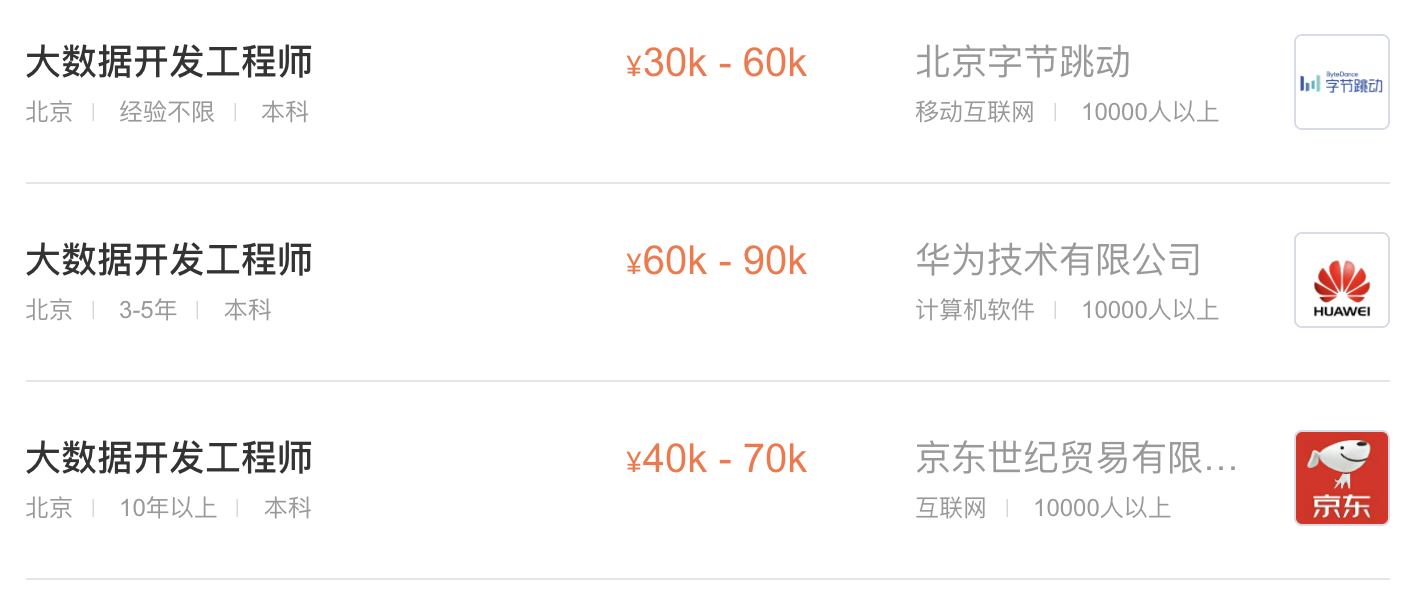 据猎聘网发布的行业报告显示,北京地区大数据人才的平均月薪已经达到24563元。即使是刚入行的小白,也可以拿到17721元的工资,而工作时间5年以上的“老人”,平均月薪可达42700元。那么我们如何转型或者走上大数据之路呢?